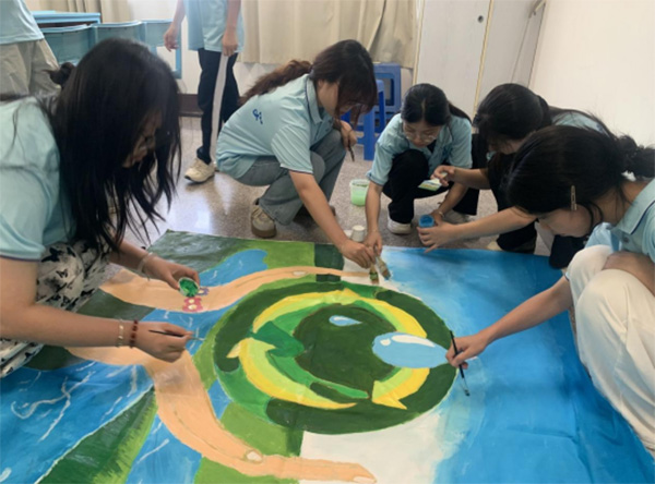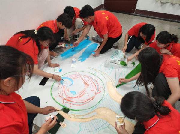 面对河长制深化推进中“宣传可视化”的现实需求,实践队以“双手托举水滴的生态球”象征护水初心,下方的河流田园晕染出“河畅景美”的生态长卷。活动中,实践队员分工协作,完成轮廓勾勒、颜料调试与纹理绘制。通过呈现生态球、双手托举和河流等元素,直观地向当地居民传递护水理念,使素朴画布变成生态宣传载体,呼吁大家关注河流治理问题,推进生态文明建设。实践队将创作好的画布悬挂在墙体之上,以此唤醒居民护水意识,推动河长制理念融入居民日常。