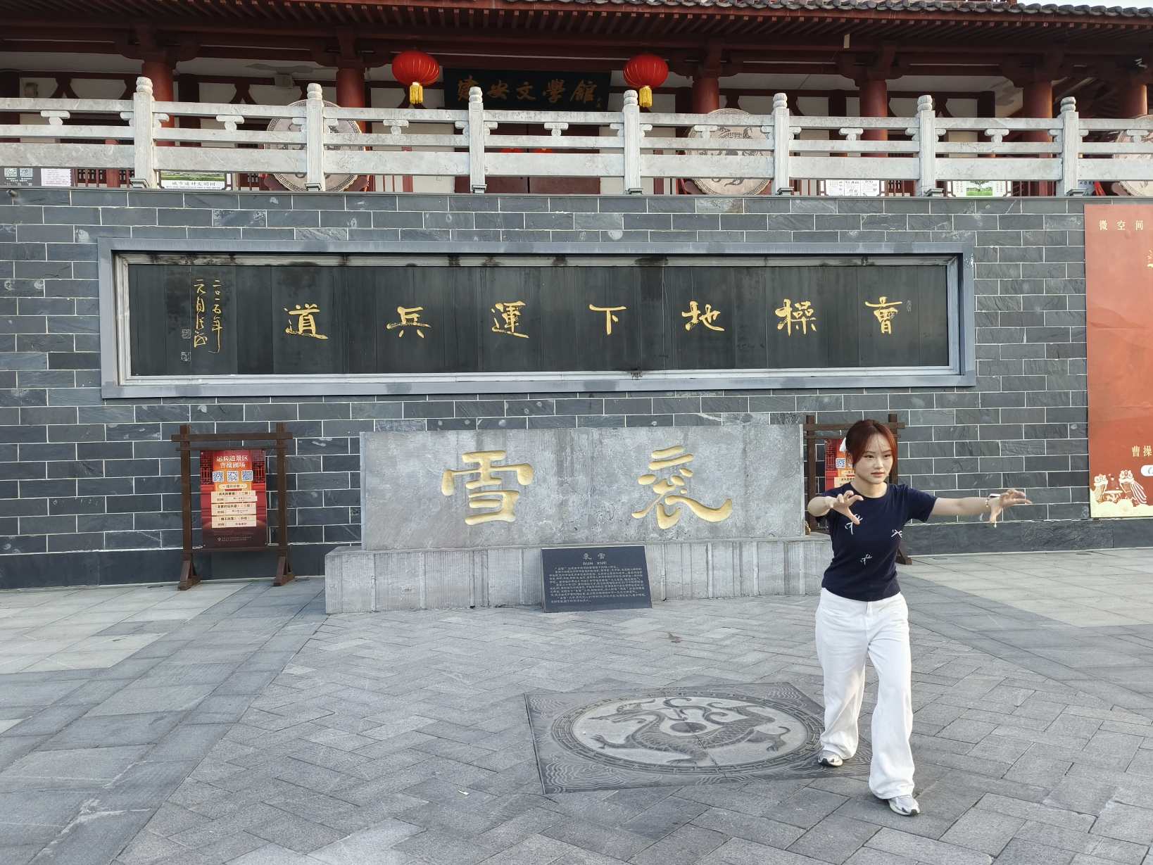 实践团队创新采用"学习-实践-传播"三位一体模式,在曹操运兵道这一三国文化遗址中开展非遗展示。地下迷宫般的运兵道前,丰飒爽通过模拟仙鹤展翅的舒展姿态,让参与者在历史场景中感受传统养生功法的独特魅力,千年非遗与现代生活在此刻产生奇妙共鸣。