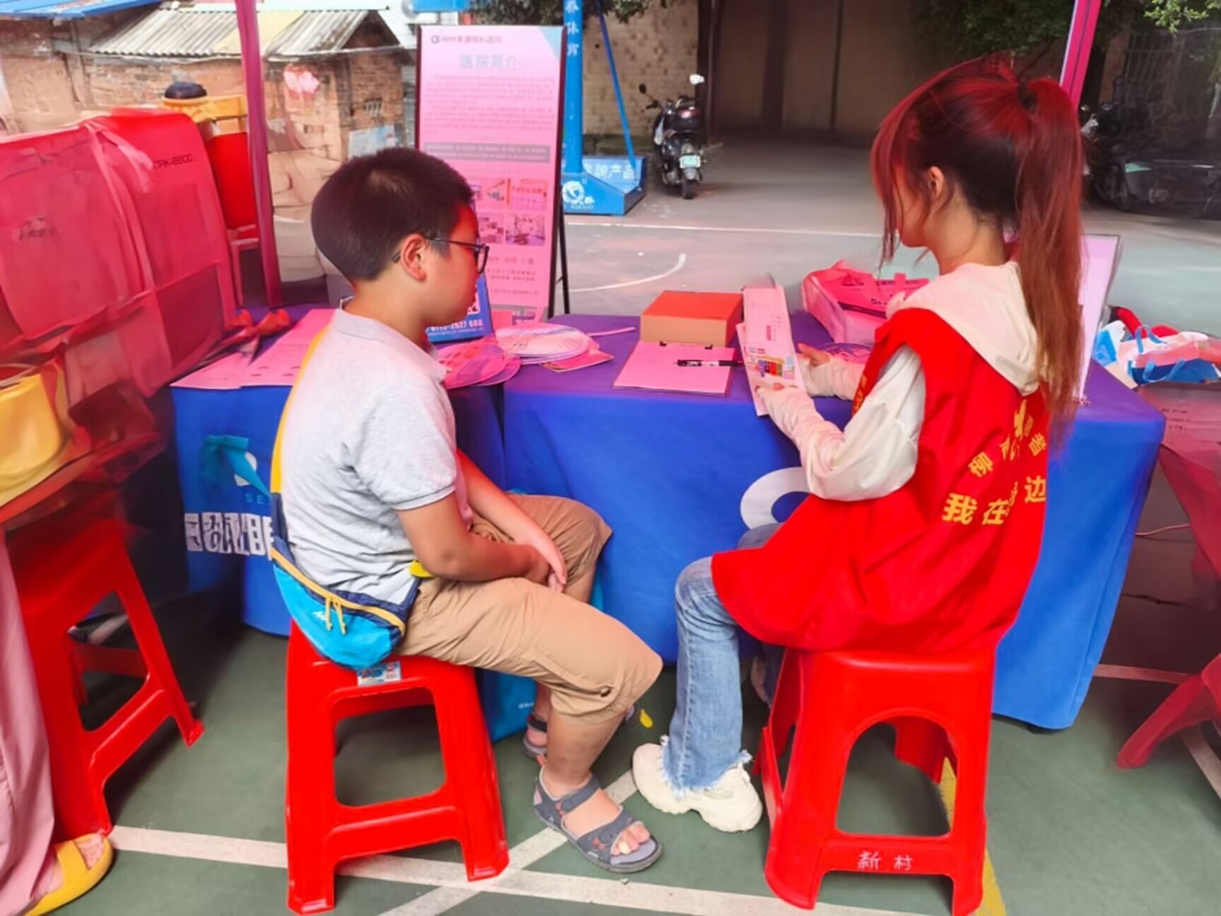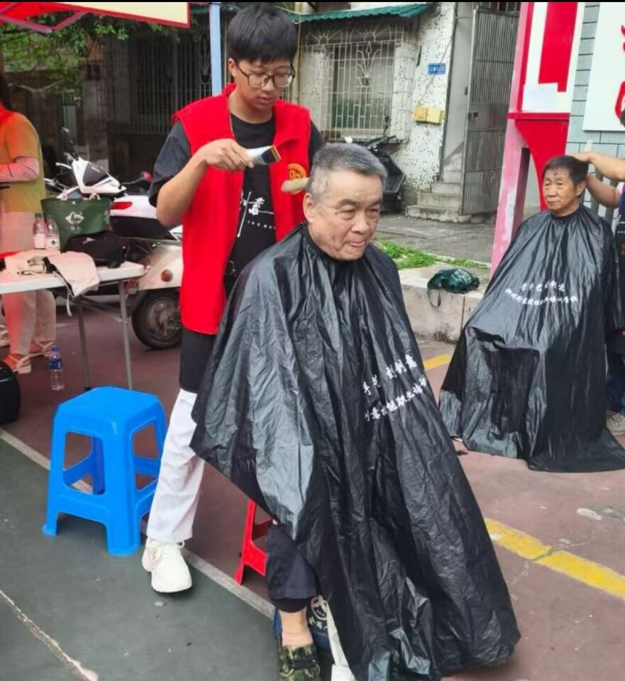 老人上了年纪后行动不便,同时也舍不得花钱,头发非常长也没有理发,我们团队在活动开展时为老人提供免费志愿理发的暖心行动,成为乡村里一道温情风景线。团队成员化身“托尼老师”,支起简易理发工具。面对前来的老人,我们耐心沟通发型需求,为老人修剪头发。围布一披,剪刀轻舞,原本有些凌乱的白发变得整齐利落。从晨光微熹到夕阳西沉,我们用双手传递温暖,让爱与关怀在发丝间流淌。