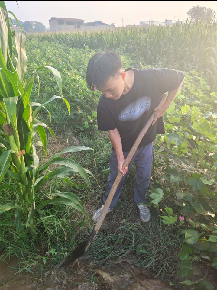 第二天上午,在朝阳初升的时刻,实践团来到了一片玉米地中,深入体会在田地中劳作的过程。正值夏季灌溉的季节,成员们扛起水管,拿起铁锹,在田地里帮助农民们输水,疏通垄沟,以保证作物的茁壮成长。实践团的成员和当地农民们在烈日下辛勤劳作的身影,正体现着“锄禾日当午,汗滴禾下土”的情景。