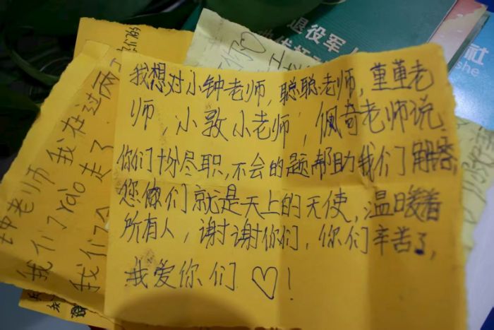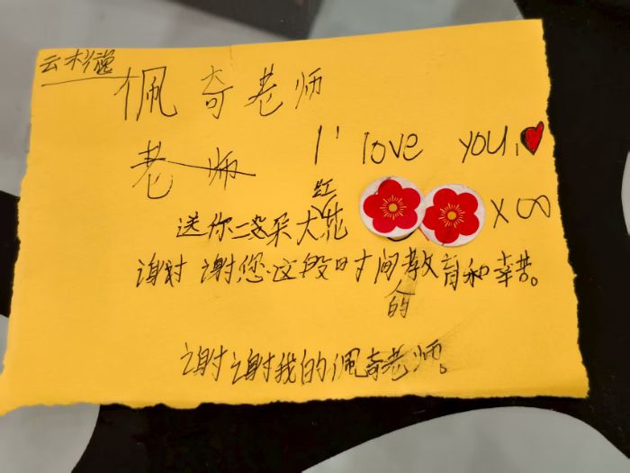 而爱,终有回响。暑托班临近尾声,孩子们伏在桌前,认真书写起给志愿者老师们的感谢信。稚嫩的笔迹、真诚的句子,还有画纸上的小红花、星星和笑脸,都是这个夏天最动人的礼物。“老师,您辛苦了”“我会想你的”“老师我爱你”……纸短情长,诉不尽的是依赖与感激。