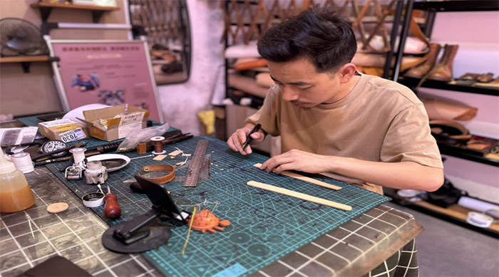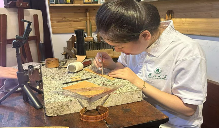 7月上旬,湖北大学曼城联合学院"楚峡荆韵"实践团队深入宜昌秭归开展文化传承实践活动。在屈原故里非遗小巷的峡江皮雕馆内,队员们执刀为笔,以皮为纸,在省级非遗传承人朱富康的指导下,系统学习了"起鼓""敲纹"等传统技法,将"凤鸟纹""龙舟纹"等楚文化经典元素镌刻于现代皮具之上,完成了一场跨越千年的艺术对话。