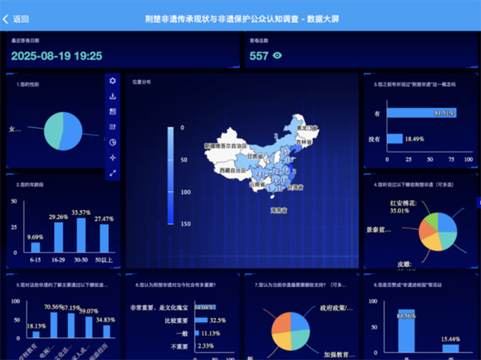 为全面洞察荆楚非遗在不同人群中的认知情况,团队通过线上渠道开展问卷调研,广泛覆盖不同年龄、职业与文化层次群体。调研数据揭示,荆楚非遗传承面临严峻挑战:仅30%的受访者能准确说出1项以上荆楚非遗项目,大多数人仅通过电视“远观”非遗,从未亲身参与体验。“社会知晓度低、传统呈现形式对大众吸引力不足”,成为制约荆楚非遗活态传承的核心难题,亟待破局。