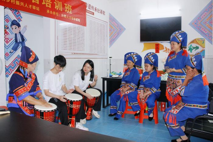 在“百千万工程”助推城乡文化融合的浪潮中,实践团四载如一日守护壮瑶文化根脉。成员们探访非遗瑶绣传承人邓俊莺,细细记录刺绣技艺从古老纹样到当代创新的流转脉络。镜头追着舞香火龙的烈焰、伴着过山瑶民歌的清亮,为5项省市级非遗留下鲜活影像,更将老艺人口中的传奇岁月细细梳成口述史。除此之外,成员们还组织起热闹的壮瑶文化游园会,领着孩子们握漆笔绘扇面、披彩衣扮盛装。抛绣球划出欢快弧线,扎染布浸出斑斓云霞。老手艺就这样化作了掌心流转的文创光彩。