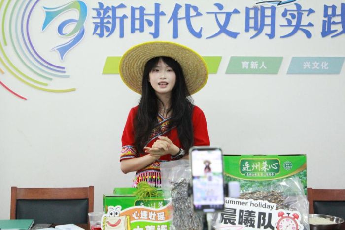 图6 2025年实践团成员在直播间介绍香韭菜(心连壮瑶实践团摄)