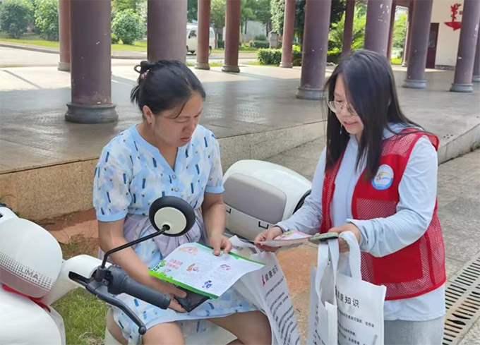 图为志愿者贾瑾云向家长发放青春健康宣传单。贾瑾云供图