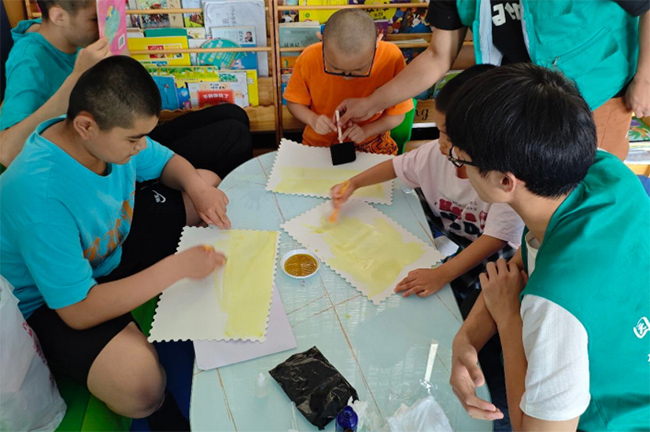 (图为团队成员指导孩子们进行植物蓝晒实验)