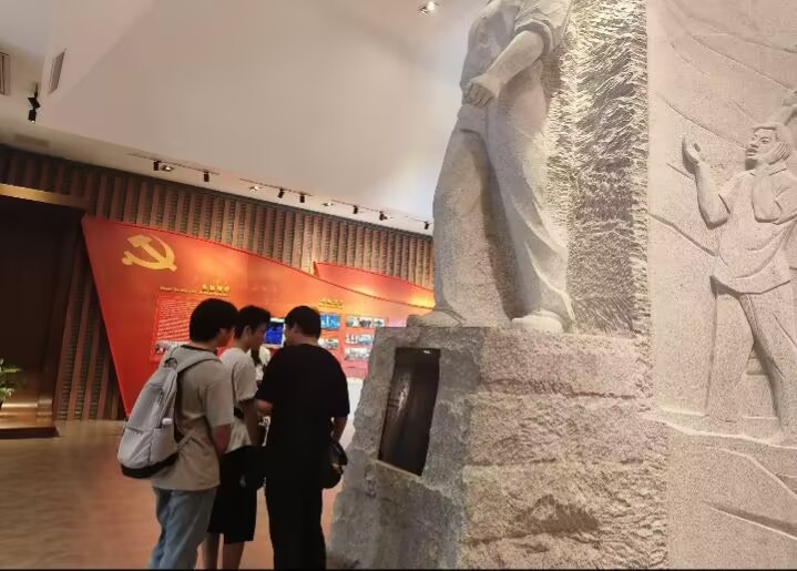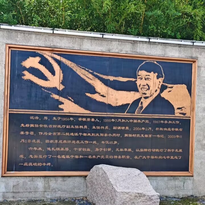 实践次日,团队转赴沈浩同志先进事迹陈列馆,深入了解沈浩同 志的崇高精神与感人事迹。步入馆内,映入眼帘的是精心设计的 布局与详实的展陈,这全方位、立体化地展现了沈浩同志作为小 岗村党委第一书记的赤子情怀与卓越贡献。一幅幅图片、一段段 影像、一件件实物,无一不深情讲述着他“两任村官沥血呕心带 领一方求发展,六载离家鞠躬尽瘁引导万民奔小康”的动人篇章。 随后,实践团成员实地探访了沈浩同志在小岗村的旧居与办公 室。所谓办公室,无非是一个低矮的房子,里面只是极其简单的 办公桌椅,这与他在村民心中的形象形成鲜明对比。“沈浩精神” 所蕴含的忠诚、担当与奉献,此时也化为青年学子们砥砺前行的强大动力。