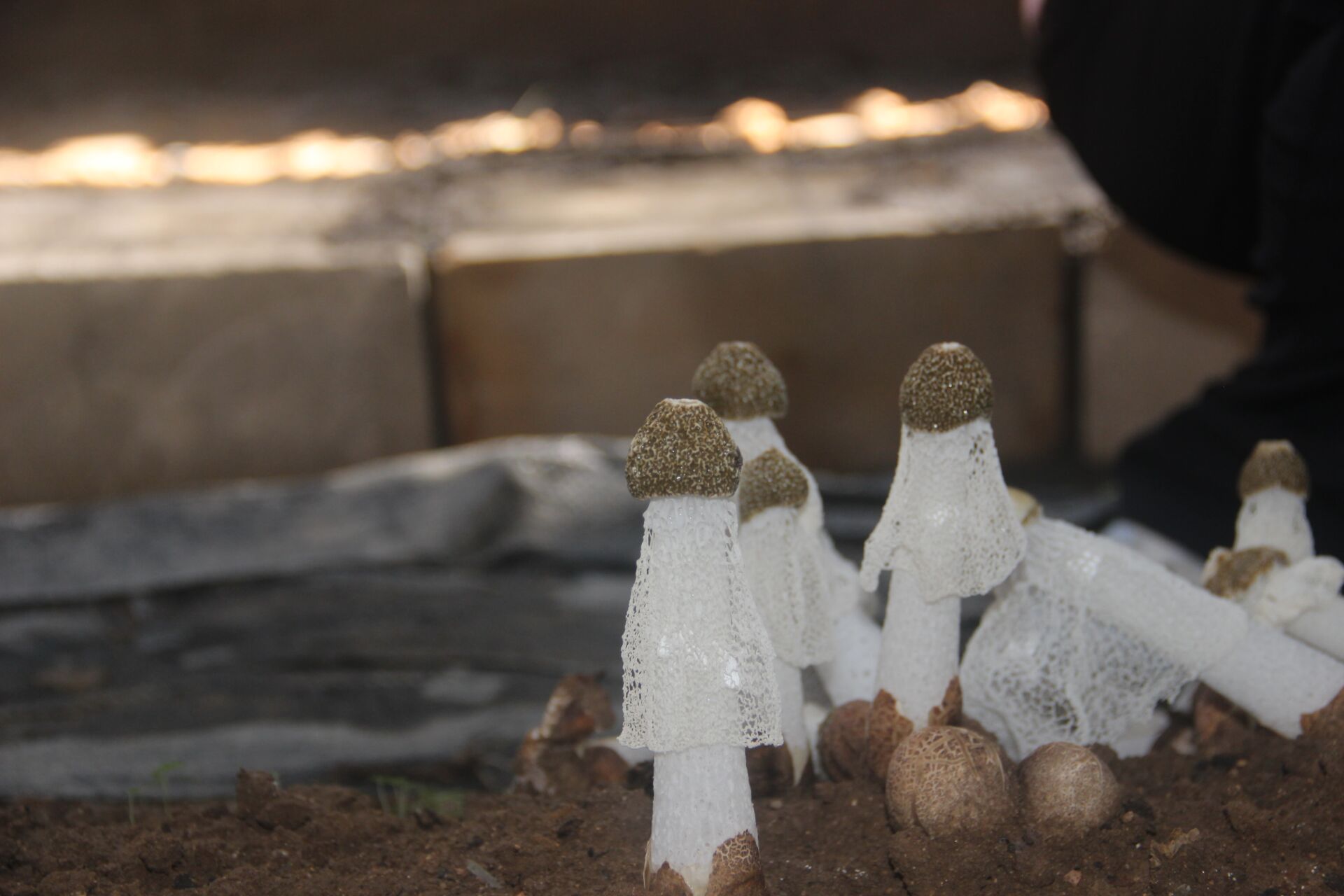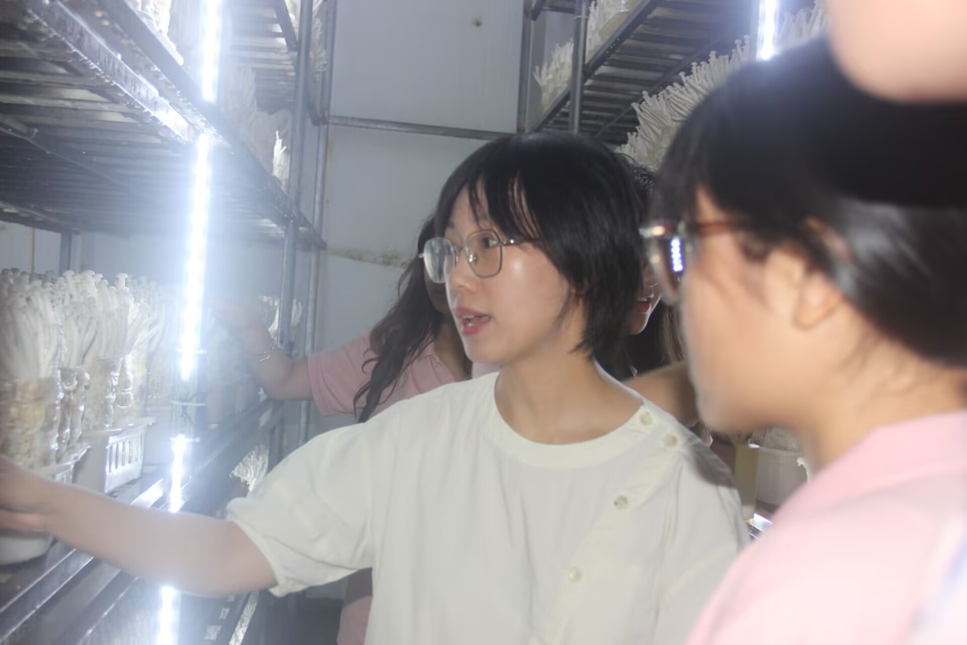 走进菇菇农场,大片的竹荪种植区,科学的光照与湿度调控为作物打造了“理想家园”,志愿者们不仅系统学习了竹荪从菌包培育到成熟采收的全流程技术,更亲手参与采摘的乐趣,在指尖触碰间体会“科技种出好收成”的振兴底气,感受现代农业为乡村产业注入的硬核动力。