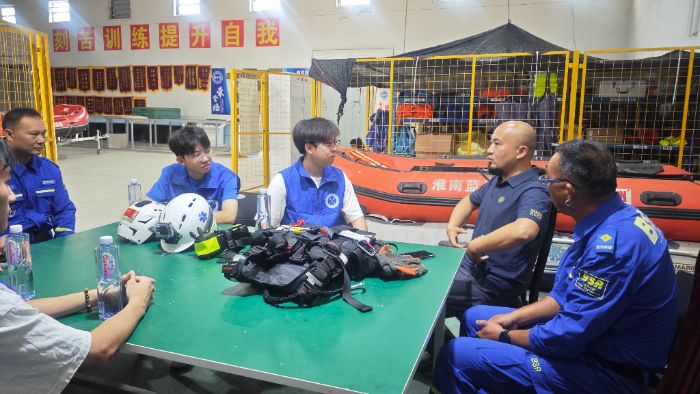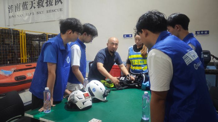 上午,调研团成员抵达蓝天救援队训练基地,刚踏入基地,各类摆放整齐的专业救援装备便吸引了大家的目光。蓝天救援队副队长热情接待团队,随后以“实物讲解+场景还原”的方式,为成员们详细介绍装备知识——从基础的救生衣、救生圈等常规救生设备,到具备定位、探测功能的先进水下探测仪器,再到应对复杂水域救援的冲锋舟、救援绳索系统,副队长不仅讲解了每类装备的核心功能,还结合过往救援案例,分享了装备在不同场景下的使用技巧与注意事项。