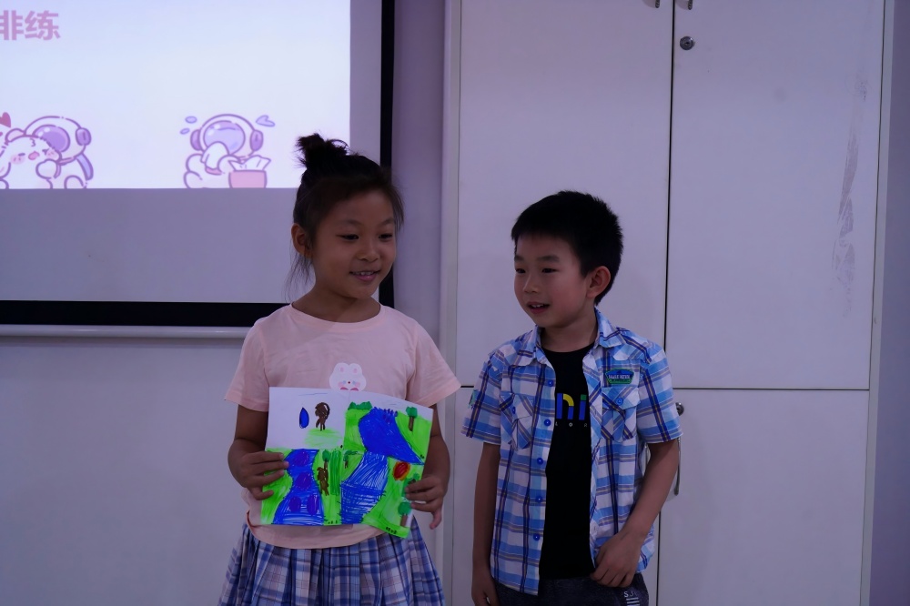 基础阶段以“兴趣激活”为核心,通过“词语接龙话生活”“声音模仿秀”等破冰活动,快速拉近与青少年的距离;为激发学生们的兴趣,实践团成员用通俗语言讲解情景剧“角色、场景、冲突”三大要素,结合“雨滴落窗”“河流叮咚”等生活化案例,帮助青少年建立艺术认知。“妙语生花,声情并茂”课程通过创新引入“四格画角色塑造”课程讲解,学生们用画笔勾勒“拯救小河的小精灵”“节水小卫士”等角色,并为画作配上台词,让抽象情感表达变得可触可感。