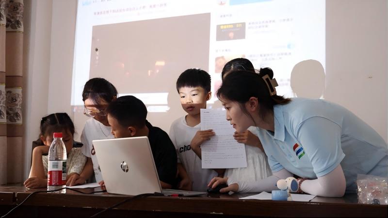 (图为实践团成员在普通话课堂上带孩子们进行趣味配音小游戏。谭皓泽供图)