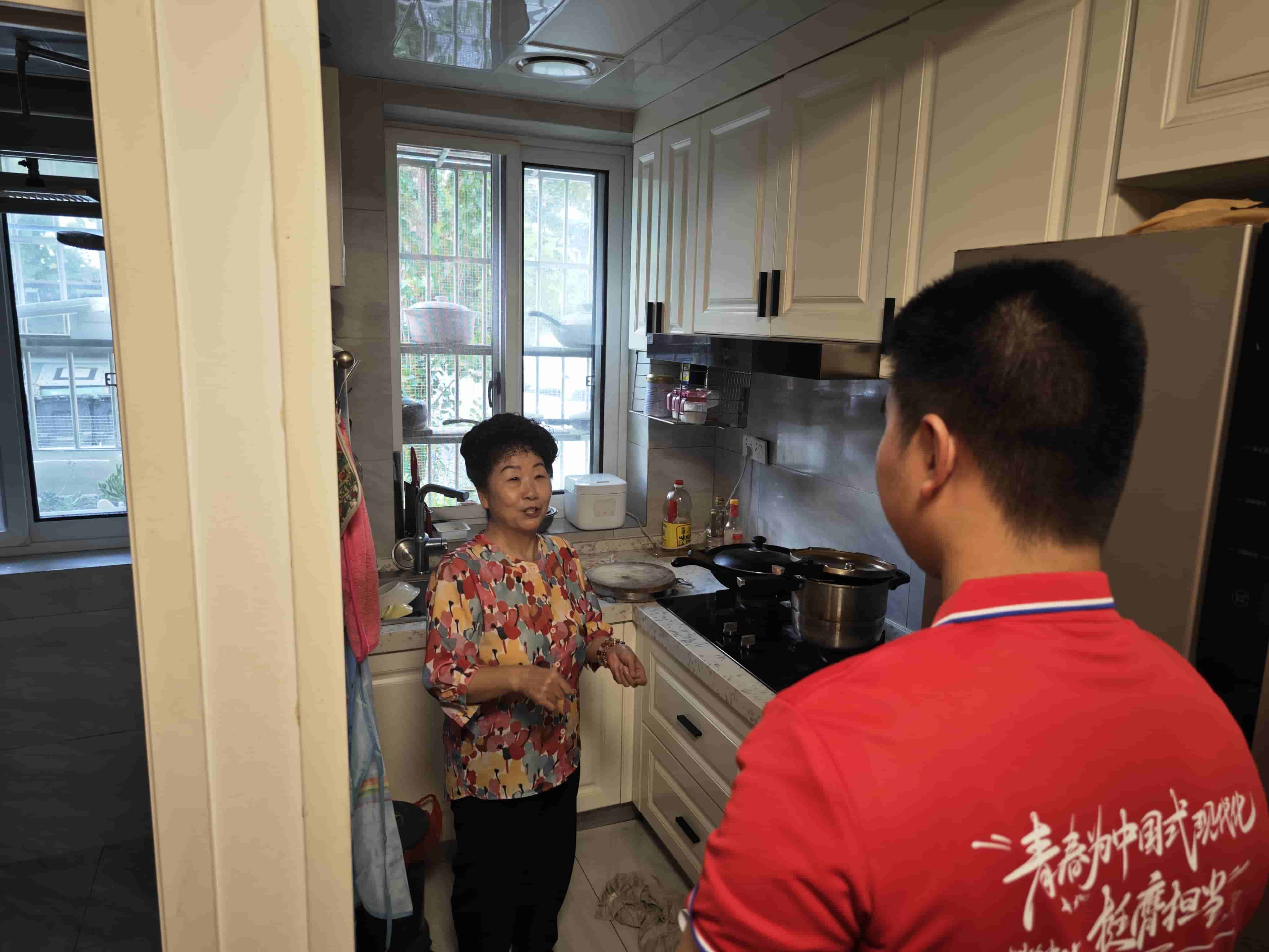 图为居民向实践团成员介绍厨具设施