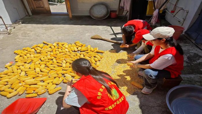 实践队队员们还热心帮助村民们晾晒玉米和稻谷。队员们汗水浸湿了衣衫,以实际行动树立了劳动意识和价值观,减轻了农户的负担,传递了爱心与温暖,展现了乡村团结互助的精神风貌。