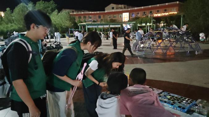 调研的最后一站,实践小队变身“科普小老师”,带着传单、问卷和小礼品,在磴口街头与中小学生互动。“沙漠里的植物为什么叶子很小?”“我们能为防治荒漠化做些什么?”遇到不懂的问题,队员们就结合调研见闻,用通俗的语言讲解。治沙需要一代又一代人的努力,我们要让保护生态的种子,在孩子们心里发芽。