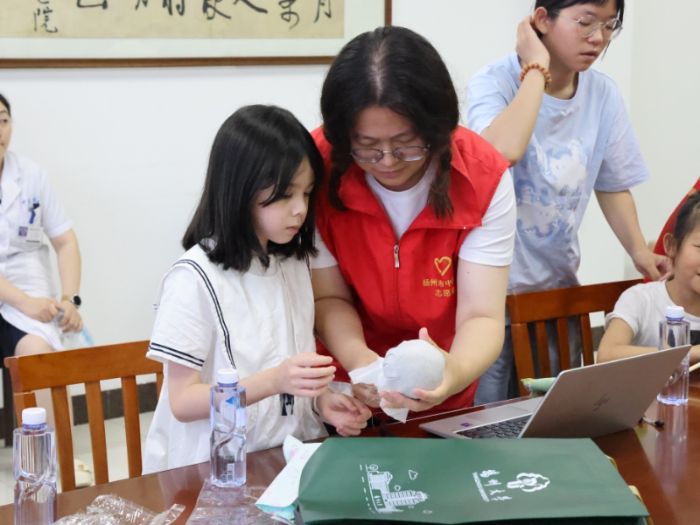 7月11日,团队与扬州市中医院合作举办"小郎中研学营"活动。15名热爱中医的中小学生化身“小郎中”,走进市中医院参加了一场“本草游园会”,沉浸式感受传统中医药文化的魅力。在这群“小郎中”中,还有两位分别来自美国和新西兰的小朋友Sasha和Darren。