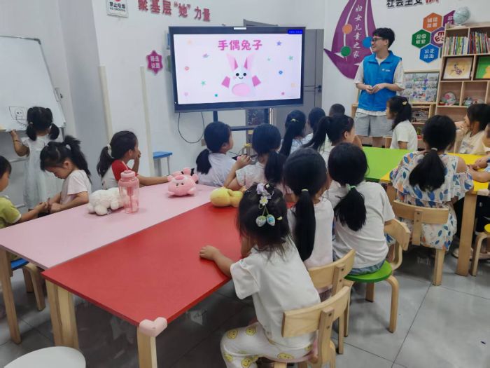 活动开场,志愿者借助大屏幕展示“手偶兔子”主题课件,屏幕上,一只软萌的粉色纸兔子端坐着。志愿者站在屏幕旁,用生动有趣的语言引导孩子们观察:“小朋友们,快看看这只漂亮的兔子,想不想也有一只啊?”瞬间引发孩子们的兴趣,大家踊跃举手,想要向志愿者学习制作纸兔子。