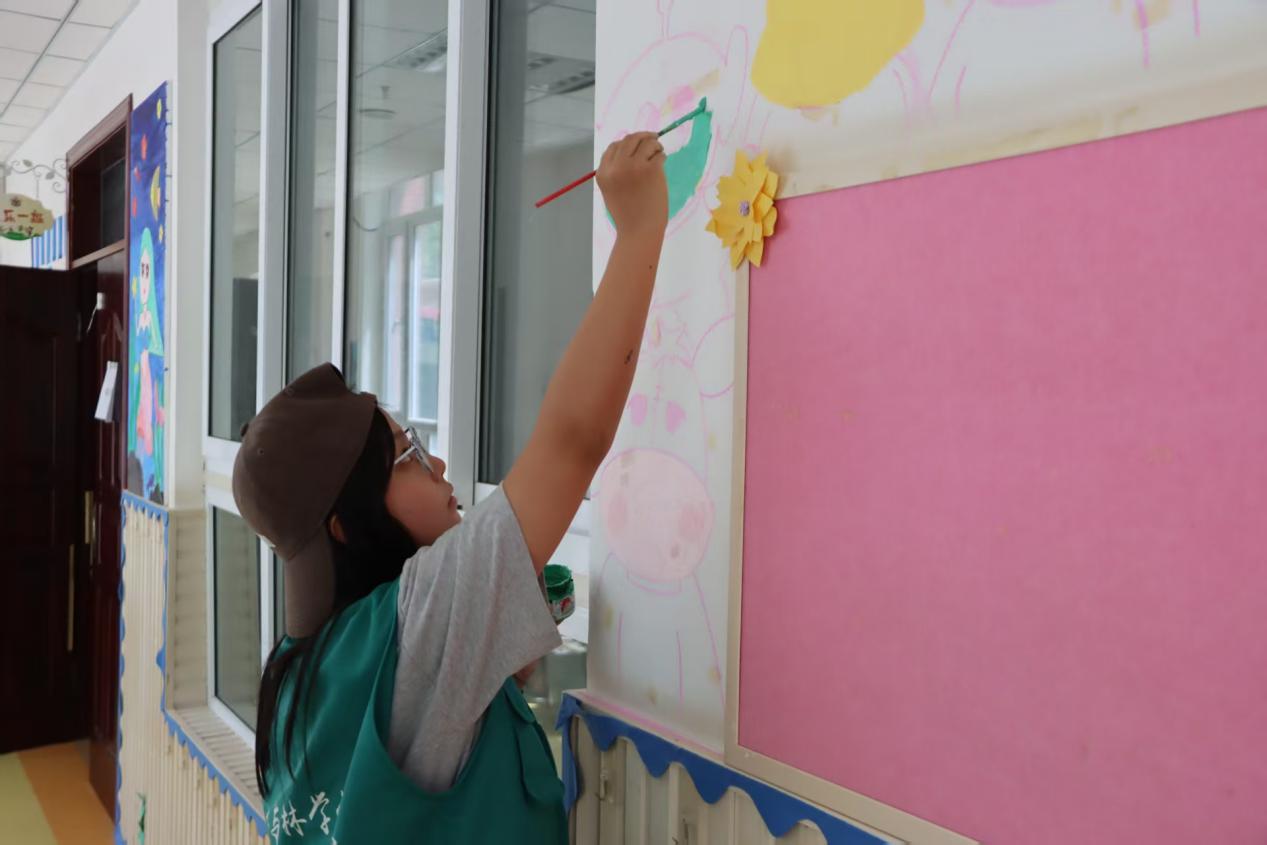 近日,塔里木大学园艺与林学学院“园韵丹青,点亮童心”志愿服务队,顶着似火骄阳走进贝尔城堡幼儿园,开展墙绘志愿服务活动,用色彩为孩子们打造充满童趣的成长空间。