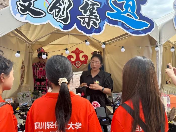 实践首站,团队来到中国古羌城,沉浸式感受羌族文化的独特魅力。在文创店铺内,刺绣精美的传统服饰、纹样别致的民族饰品让人目不暇接,店主通过一件件手工艺品,讲述着羌族先民对自然的敬畏与对生活的热爱。“我们鼓励学生将现代设计理念融入传统羌绣,让老技艺跟上新潮流。”阿坝职业学院的陈老师介绍,师生共同设计的羌绣笔记本、金属书签等文创产品已进入市场调研阶段,部分还申请了专利。