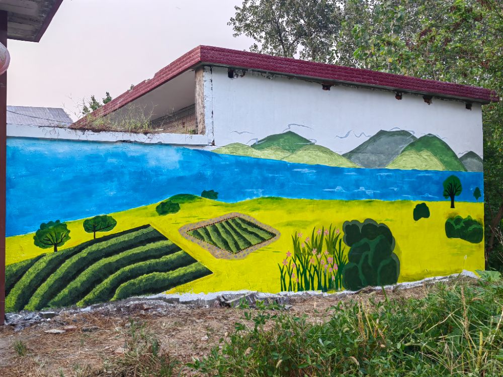 随着主体绘制进入尾声,实践团转入全面检查与微调阶段。队员们沿墙面逐段排查,从轮廓线的流畅度到色块的边界精度,从色彩饱和度到整体视觉平衡,均进行细致调整。随着最后一道工序完成,原本单调的墙面彻底焕然一新。整幅墙绘以“人与自然和谐共生”为主题,融合长山村本地自然元素与田园意象,既展现了乡村的生态之美,也传递出环境保护的深刻内涵。墙绘完成后,路过村民驻足观赏,对完整墙绘作品的视觉效果与生态内涵给予高度评价,“共建生态乡村”的氛围愈发浓厚。