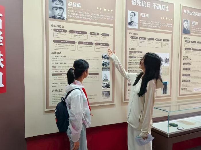图为实践团成员向学生介绍抗战英雄人物 钱宁盈 供图