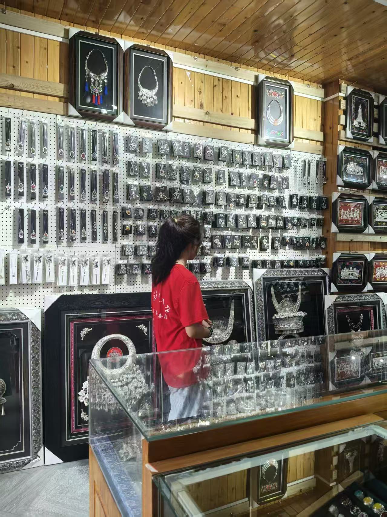 刚踏入苗寨商品店,银饰的光泽、刺绣的艳丽,瞬间把大家包围。那些银饰,在灯光下闪着清冷又温润的光,匠人们手工錾刻的纹路,像把苗家的山水、神话都揉了进去;刺绣更是,五彩丝线在布上 “跳舞”,花鸟鱼虫、古老图腾,一针一线都在讲苗寨的故事。