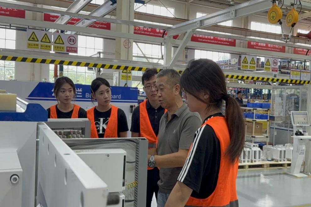 实践团队前往港口工业园区内的一家企业。在生产车间,实践队员与企业环保部负责人交流,询问屋顶光伏板矩阵与储能系统的运行情况,了解清洁能源在生产中的应用占比等信息;同时,实践队员还关注到企业在产品设计阶段融入的低碳理念。这些从负责人讲解中获取的内容,让队员们对企业节能有了直观感受,也激发了实践团队对 “微观节能” 与 “宏观减排”关联的思考。
