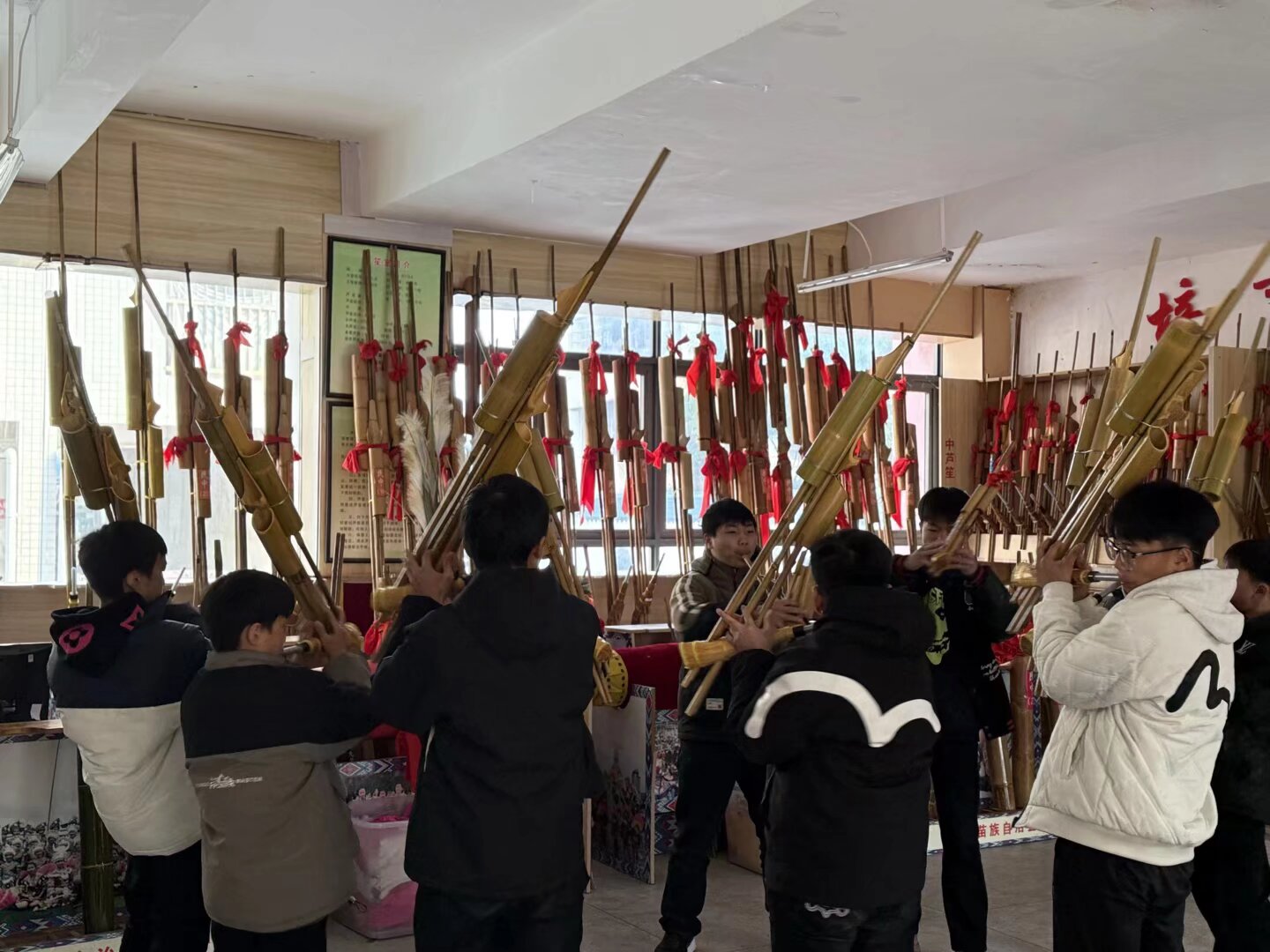 老师介绍,孩子们大多来自周边苗寨,基地训练全年无休。他分享了一个故事:去年有个初一新生起初觉得芦笙“费力又不好听”,直到一次苗寨采风,被老艺人的演奏打动,从此主动加练,如今已是队里骨干。