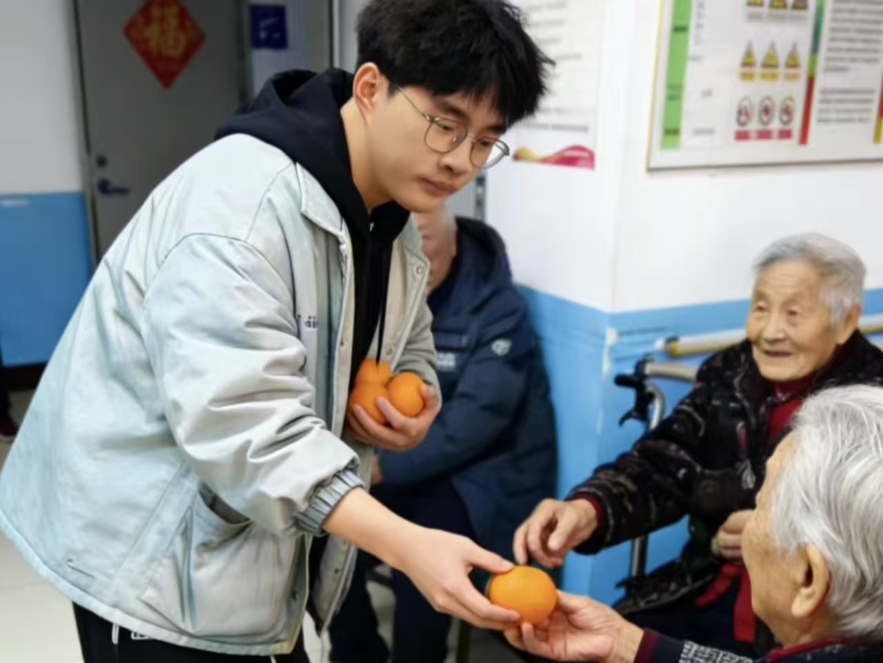 此外,成员们还贴心协助护理人员照料老人日常生活,为行动不便的老人打水喂饭、修剪指甲、梳理头发,带领身体条件允许的老人开展慢走、关节活动等简单康复训练,用细致周到的服务守护老人们的身体健康。
